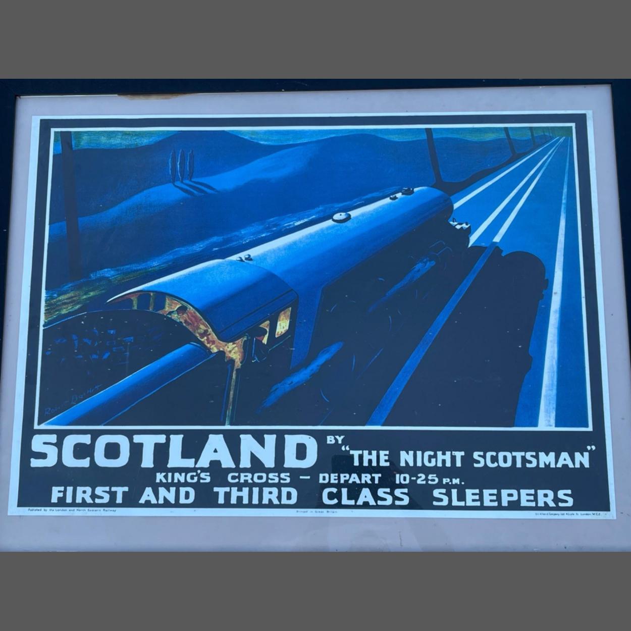 VERY LARGE RAILWAY framed poster SCOTLAND by The Night Scotsman - King's Cross Depart 10.25pm - 'First And Third Class Sleepers' Poster produced by London & North Eastern Railway (LNER) to promote overnight rail services to Scotland by “The Night Scotsman” locomotive.poster by ROBERT BARTLET 1932 - dimensions 47" x 36" approx - impressive!