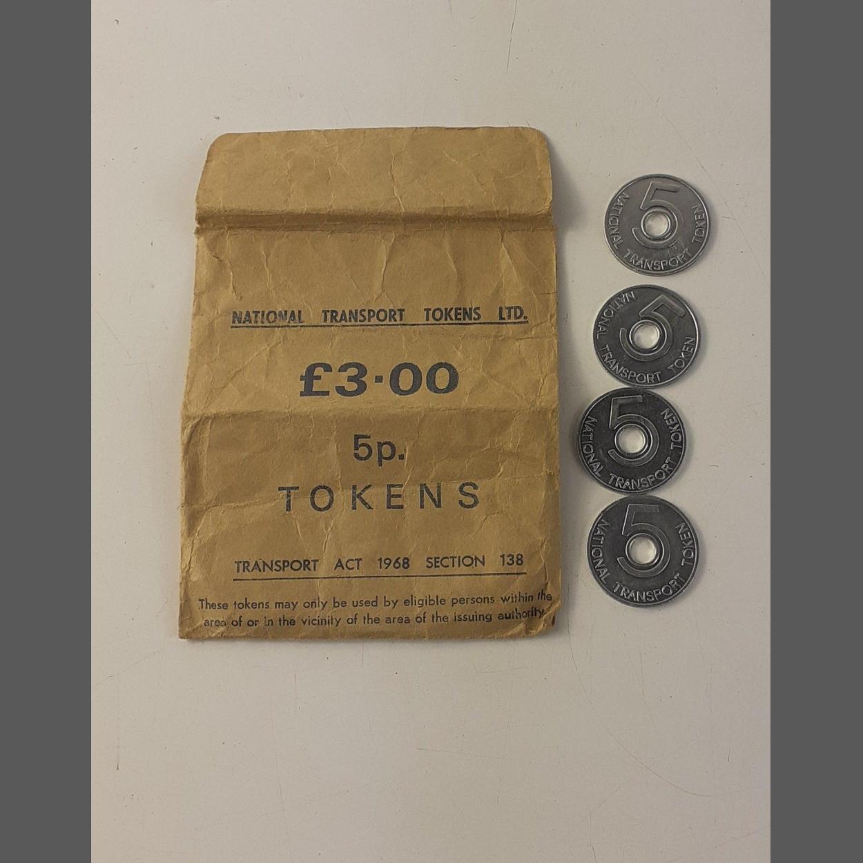 A collection of 4 NATIONAL 5p TRANSPORT TOKENS within their original envelope - Transport Act 1968 section 138