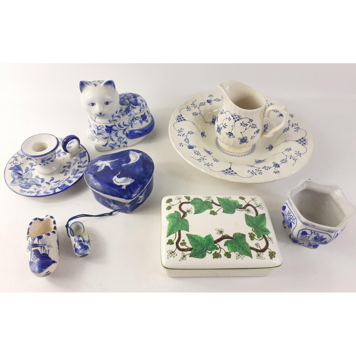 A mixed lot of blue and white ceramics to include a cute lidded cat trinket piece 12cm length x 12cm height approx and other items with also a NAPOLEON IVY patterned ceramic lidded box similar to what Napoleon used 14cm length x 3.5cm height x 10.5cm depth approx