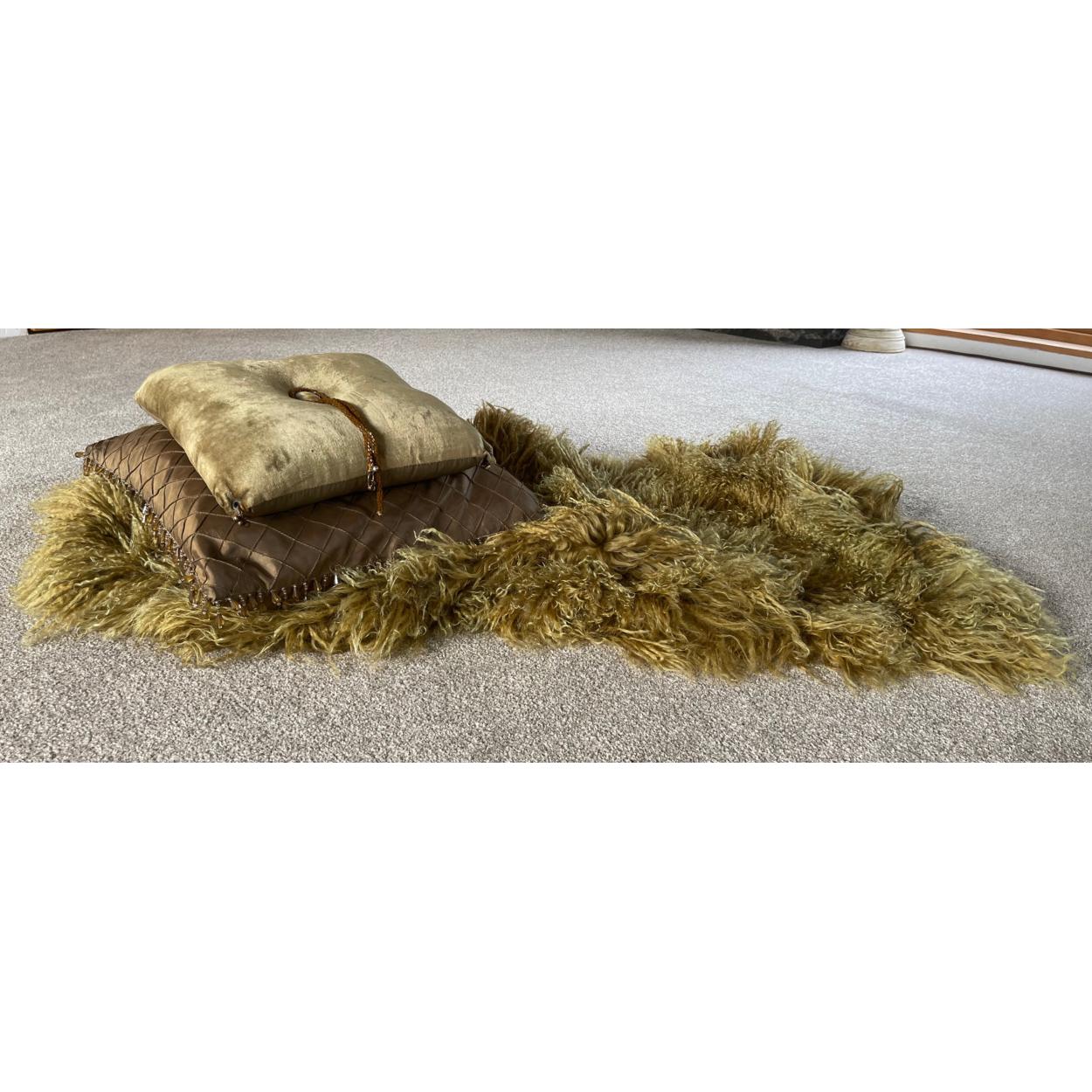 A REAL sheepskin rug with a selection of two fashion cushions to boot! - dimensions of the rug 4ft width x 2ft depth approx