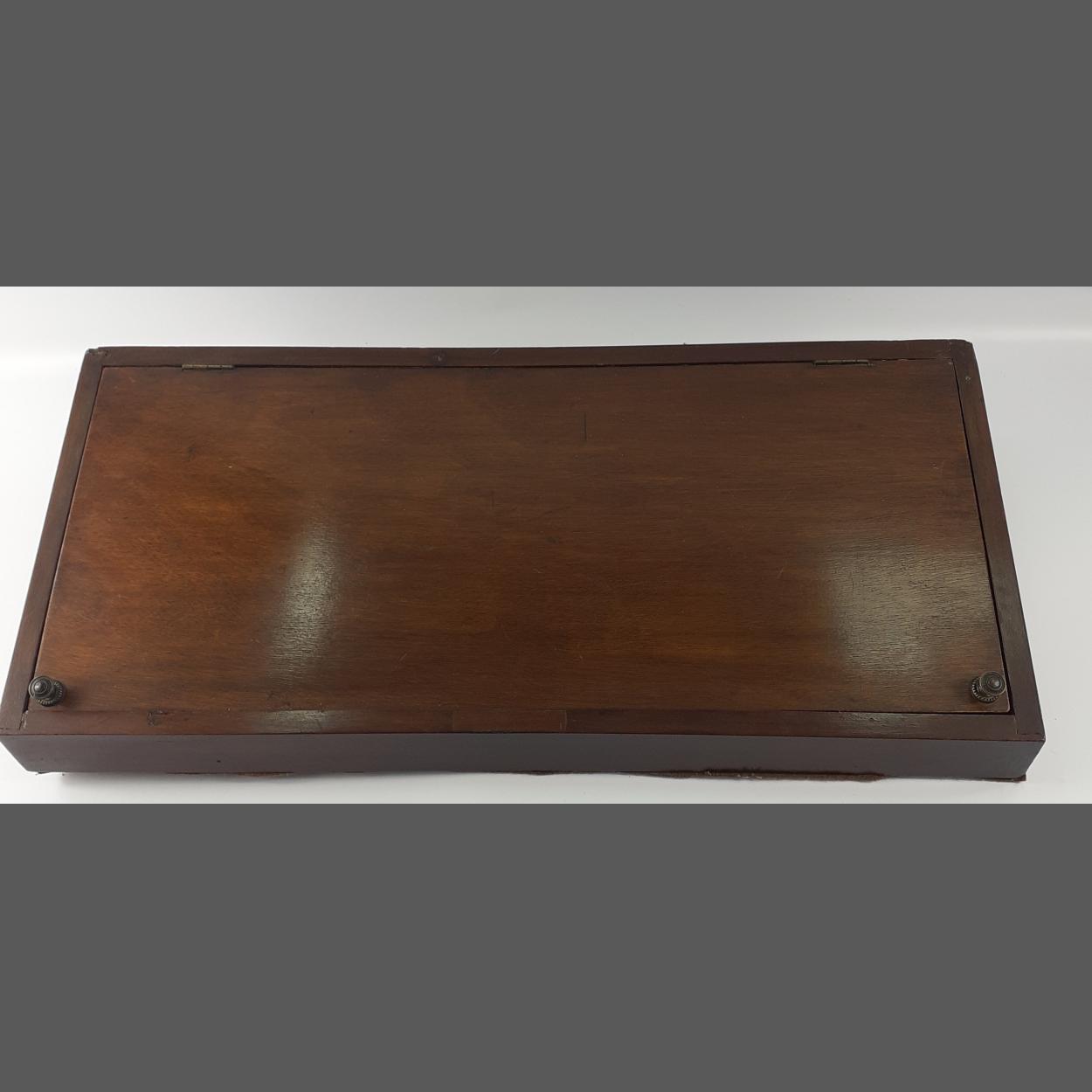 A wooden sloping vintage storage box 56cm wide, 25cm deep and 9cm high at the rear. Interesting useable piece for display or storage