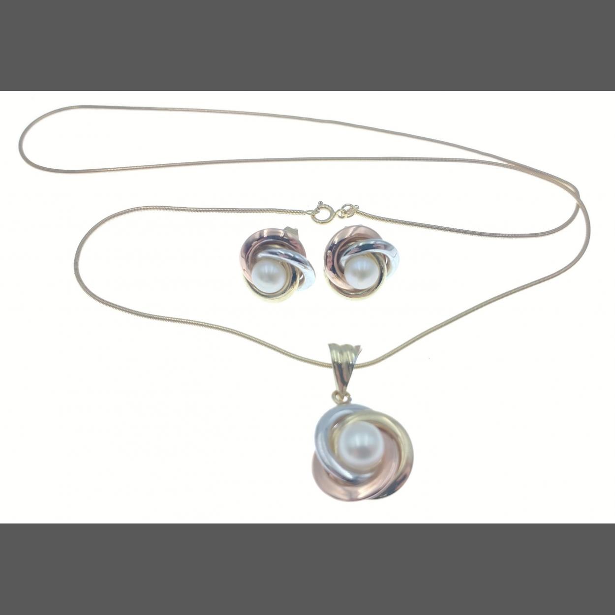A yellow metal 14K marked chain and pendant set with a real pearl centre and matching stud earrings, chain 42cm approx, gross weight 11.78g