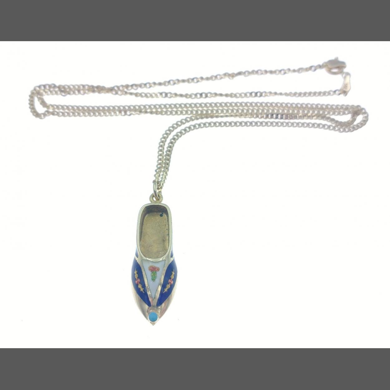 A yellow metal 14K marked chain and pendant pendant in style of Middle Eastern slipper with blue/white enamel and a small turquoise pompom on toe of slipper, gross weight 7.40g approx, 42cm chain