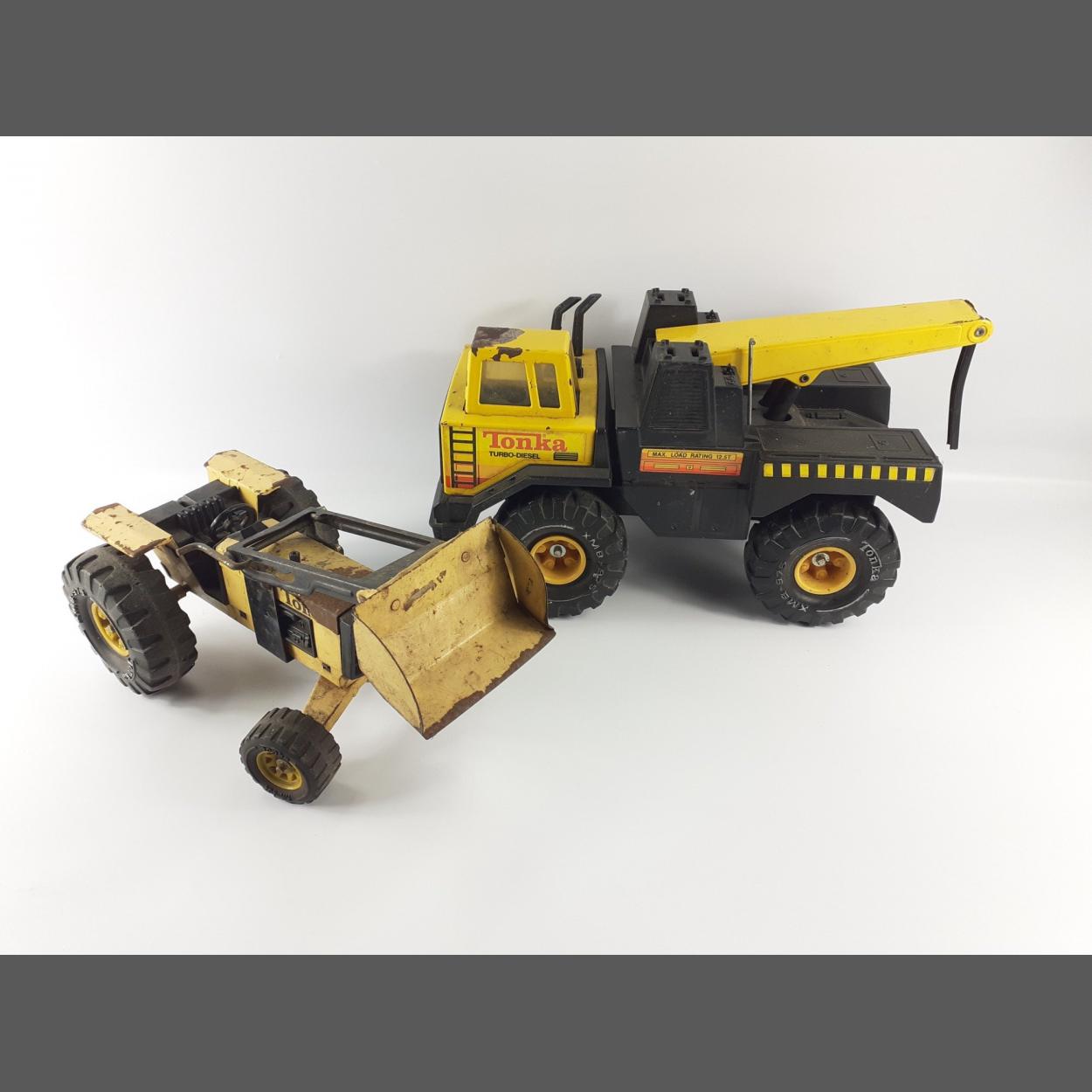 Two TONKA models to include an older metal bodied one with light surface rust and a more modern large plastic crane with light damage.