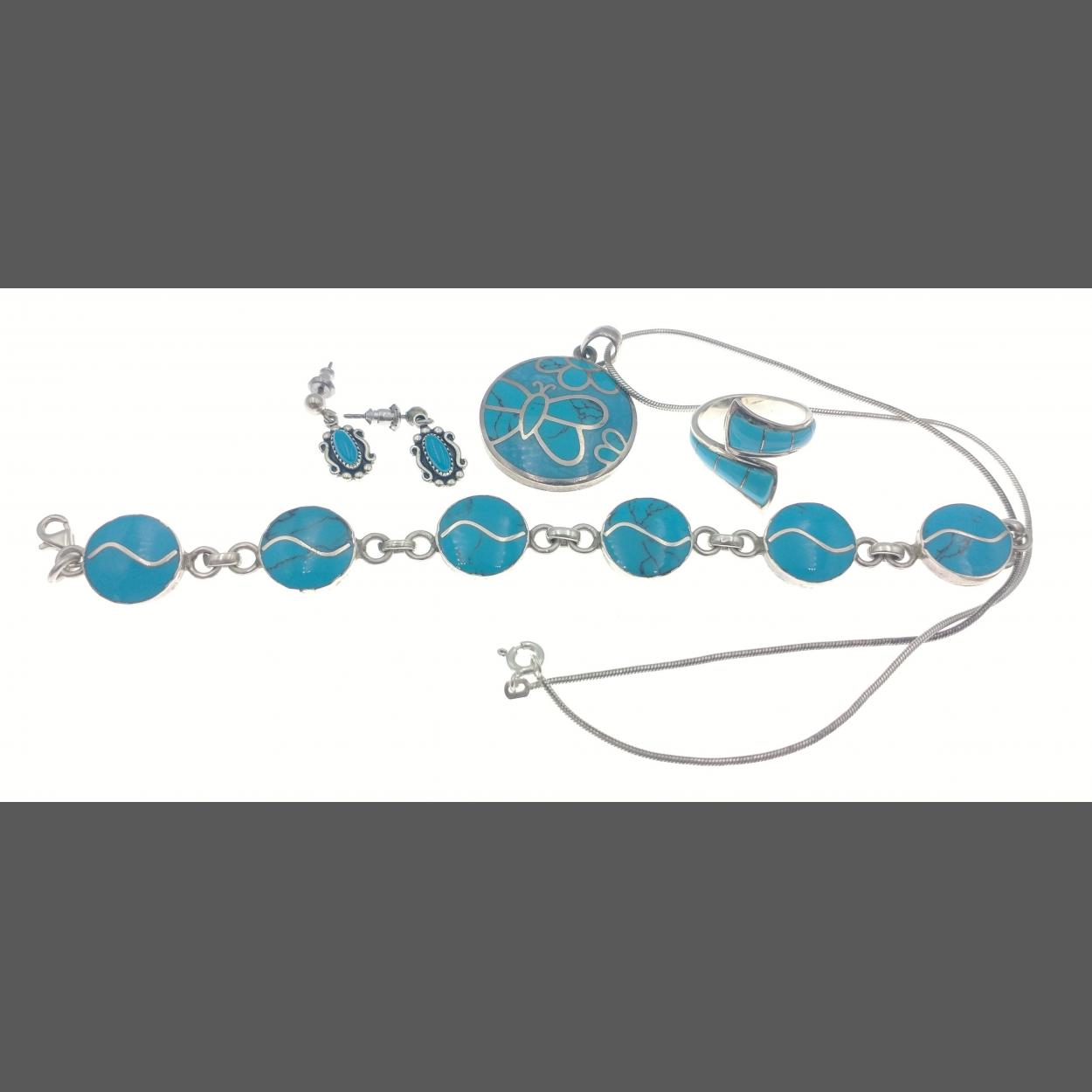 A 925 stamped silver turquoise enamelled suite of jewellery to include pendant and chain, bracelet, stud earrings and ring gross weight 39.50g approx, pendant 36cm long approx, bracelet 14cm approx, ring size O,