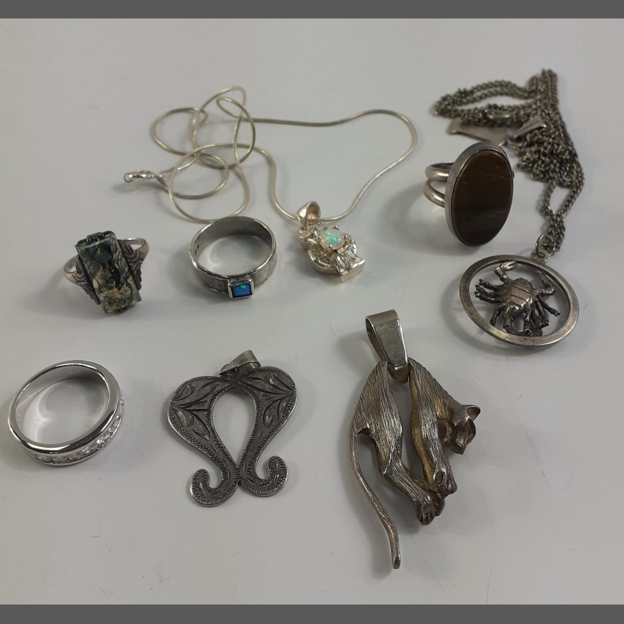 A small bag of assorted 925 stamped silver to include a leopard pendant, and a lobster pendant on chain, two rings size O, one size N, total weight 52.34g approx