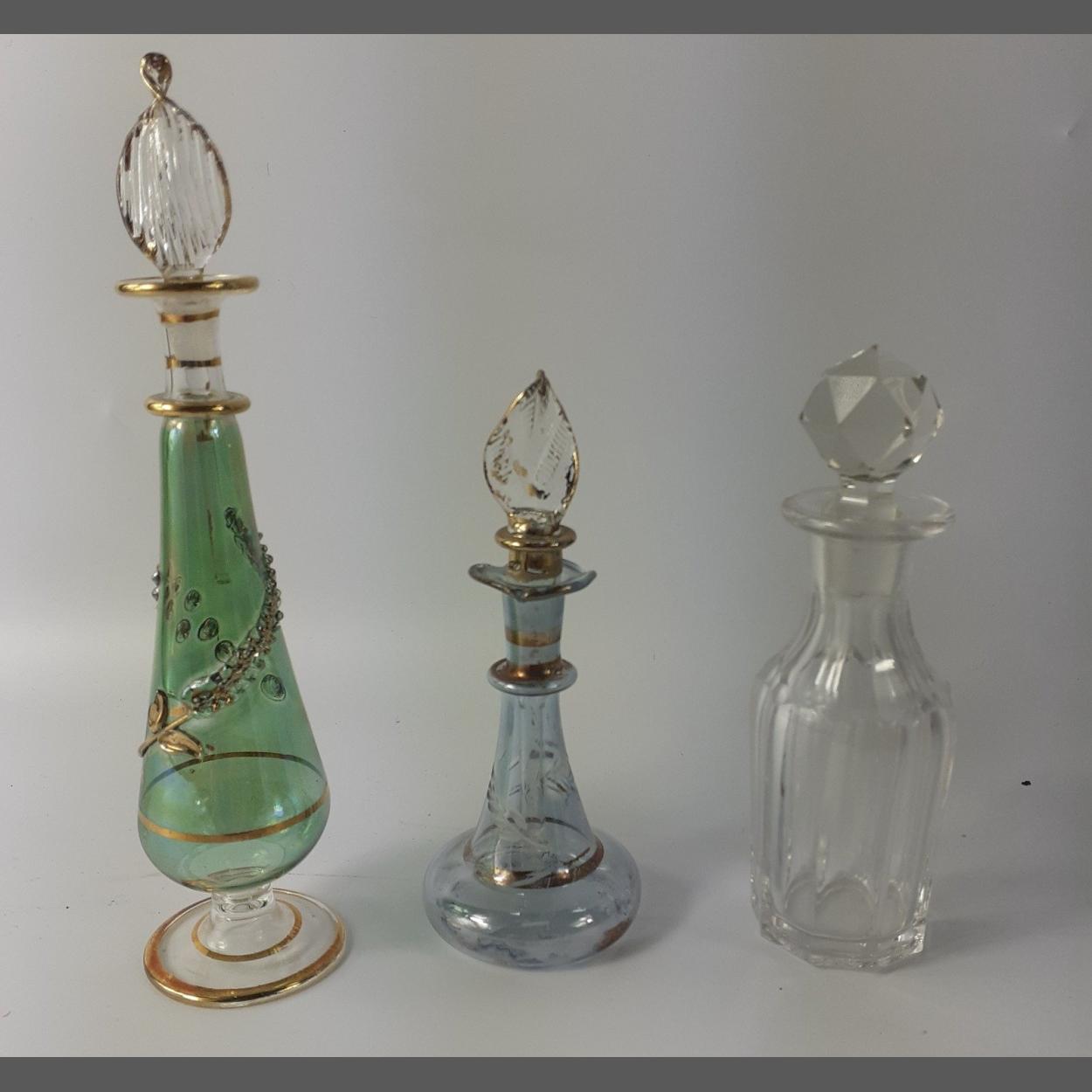 Three pretty delicate small perfume bottles. The tallest 16cm. All three in good order with stoppers / dropper.