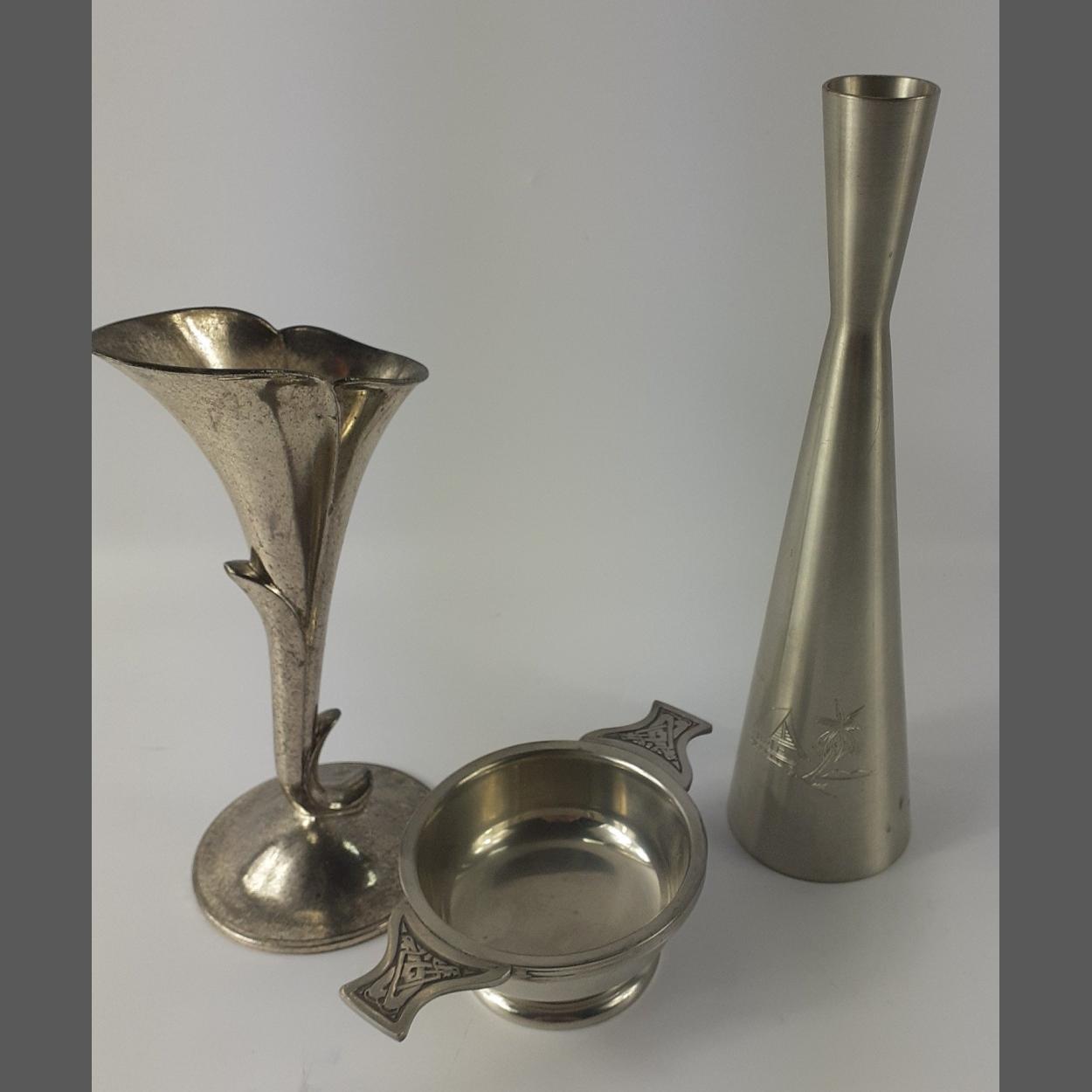 Small metalware group of three items. Small decorative Selangor Pewter rose vase 20cm approx, tulip style vase and a small pewter quaich by Forrest of Glasgow.
