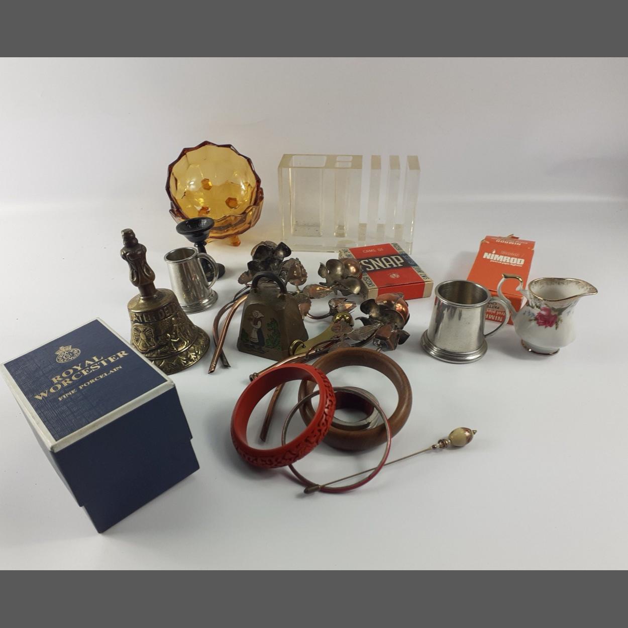 A mixed box of assorted items to include a boxed Royal Worcester porcelain egg coddler, brass bell, decorative copper flowers and others.