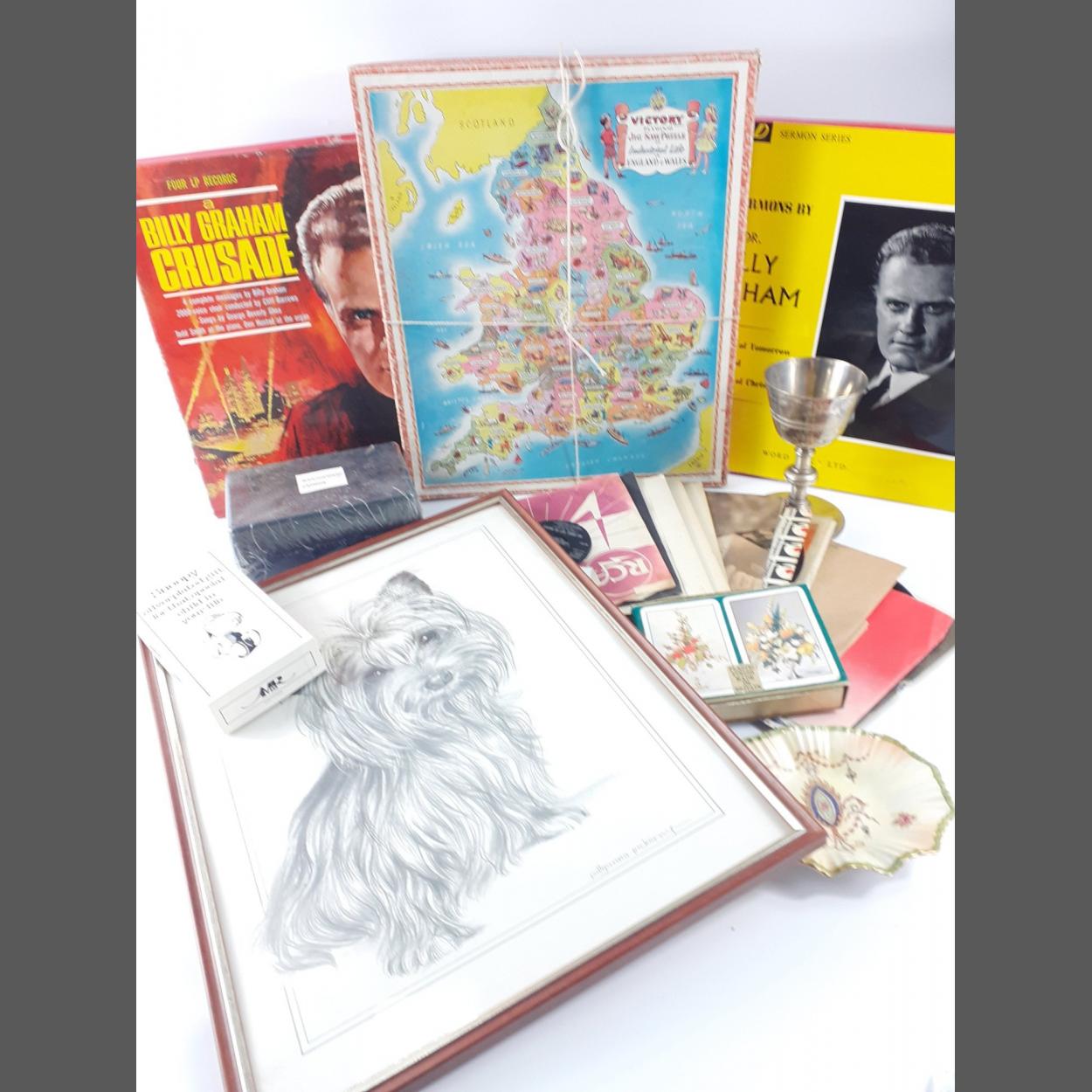 A mixed box to include a small selection of 45rpm singles including We Shall Not be Moved by The Seekers, The Old Rugged Cross by Ethna Campbell, 33rpm Billy Graham sermons, a man's toolset, 2 packs of playing cards, a jigsaw puzzle map of England and Wales, a white metal goblet 14cm tall approx etc