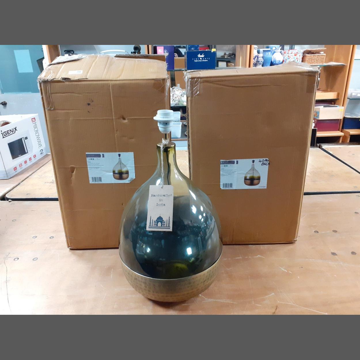 Two Endon Lighting SULTAN base only table lamps, model 69804, boxed and unused. Lamps are tinted green glass and satin brass finish, height 520mm, diameter 300mm