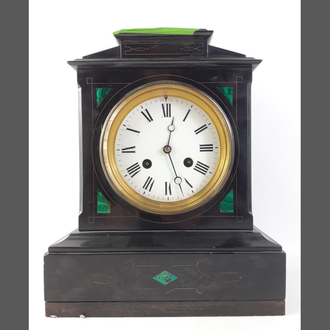 A VICTORIAN black slate clock with green Malachite inset pattern design - the clock has undergone a full service by a Galashiels clocksmith in recent years - the condition of this clock is good - dimensions 28cm height x 22cm width approx - comes with two keys