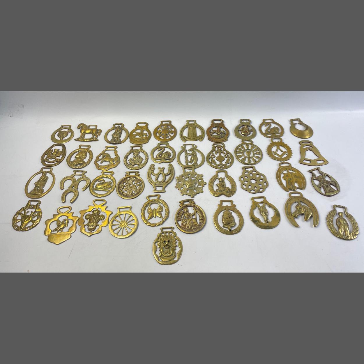 Approximately forty traditional & collectable vintage brass HORSE BRASSES to include a stunning MASONIC symbolic SQUARE AND COMPASSES horse brass !