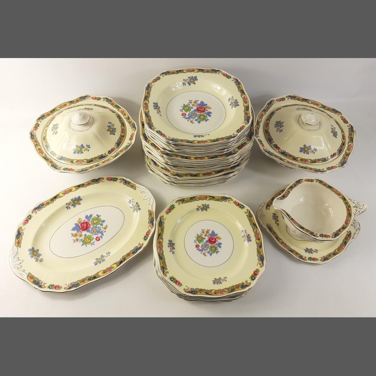 ALFRED MEAKIN part dinner set comprising two lidded dishes, an oval sandwich plate, a quantity of assorted matching plates and a sauce boat. 28 pieces in total. Generally good condition, minor rubbing.