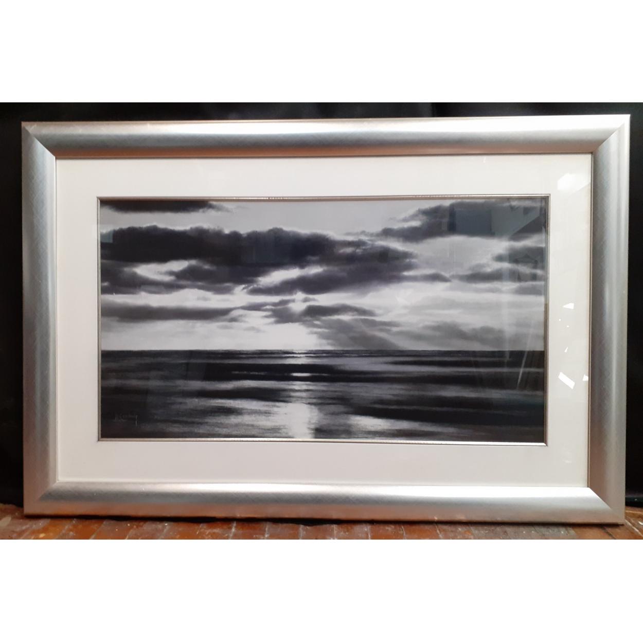 An ORIGINAL MONOCOLOUR GRAPHITE DRAWING by WENDY CORBETT OF A SEASCAPE. Frame measures approx. 106cm in length x 70cm. The visible work measures 78cm in length x 42cm in height.