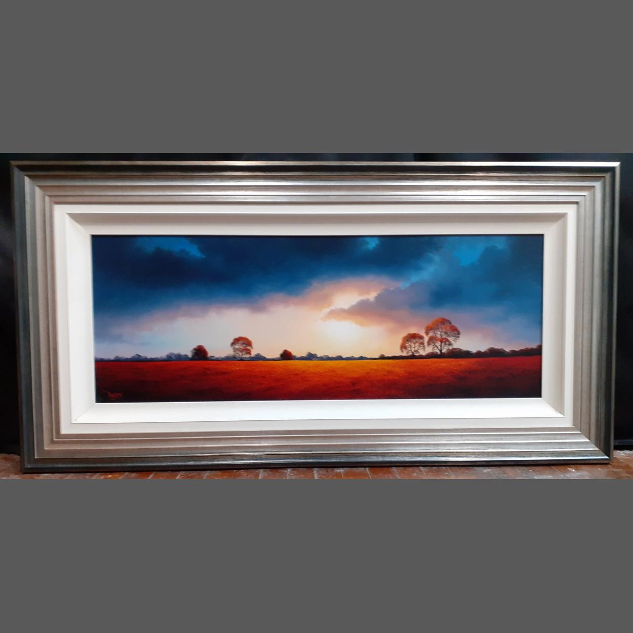 An ORIGINAL OIL ON BOARD PAINTING by DAVID RENSHAW of an atmospherically peaceful country meadow scene. Frame measures approx. 129cm in length x 65cm in height. Visible work measures approx. 100cm in length x 37cm in height. Comes with a signed Gallery sheet by David Renshaw showing the artwork in question.
