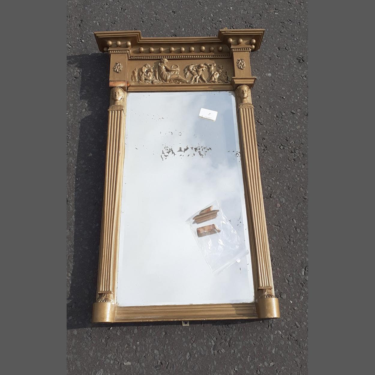 An antique silvered gilt framed mirror with some age. Mixed style with a Greco Roman fresco above and Egyptian Sphinx head and feet at sides. Light peeling to the silvering and some damaged edging (pieces all present). Measures 101cm tall and 65cm wide approx.