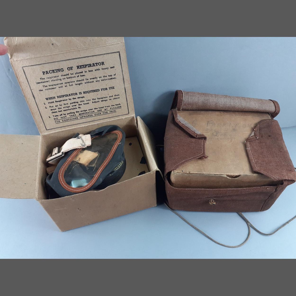 Two boxed GAS MASKS, one with canvas case. Both appear complete but with perishing to the rubber.