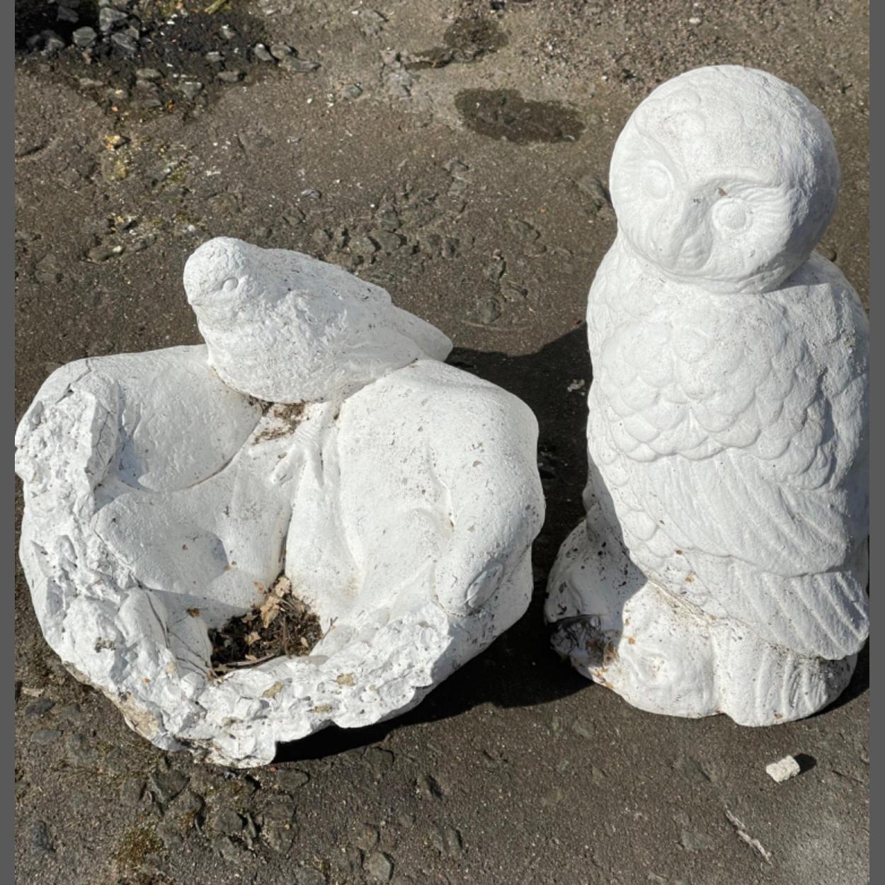 Two white painted garden stone-effect ornaments to include a standing TWIT-TWOO Owl 10" tall approx and a PERCHED bird on a stone - would look interesting propped-up in your garden border!