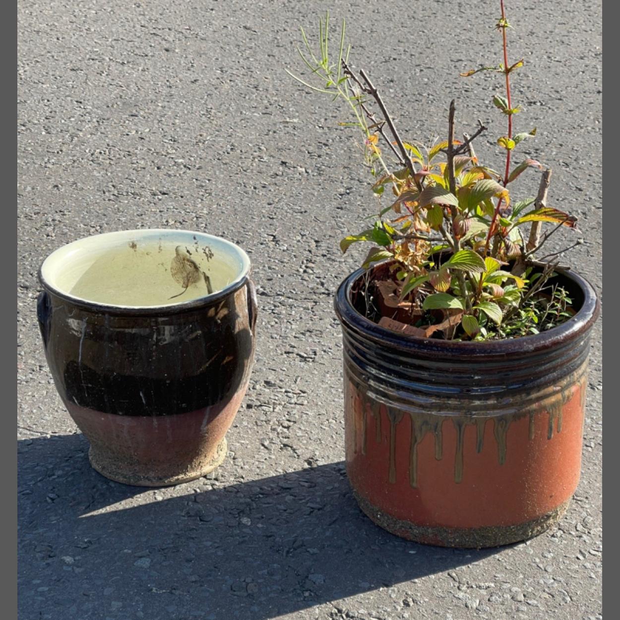 A medium sized drip-glazed plant container including seasonal planting - container approx 10" height and one other slightly smaller glazed ceramic container with a nice cream glaze interior etc
