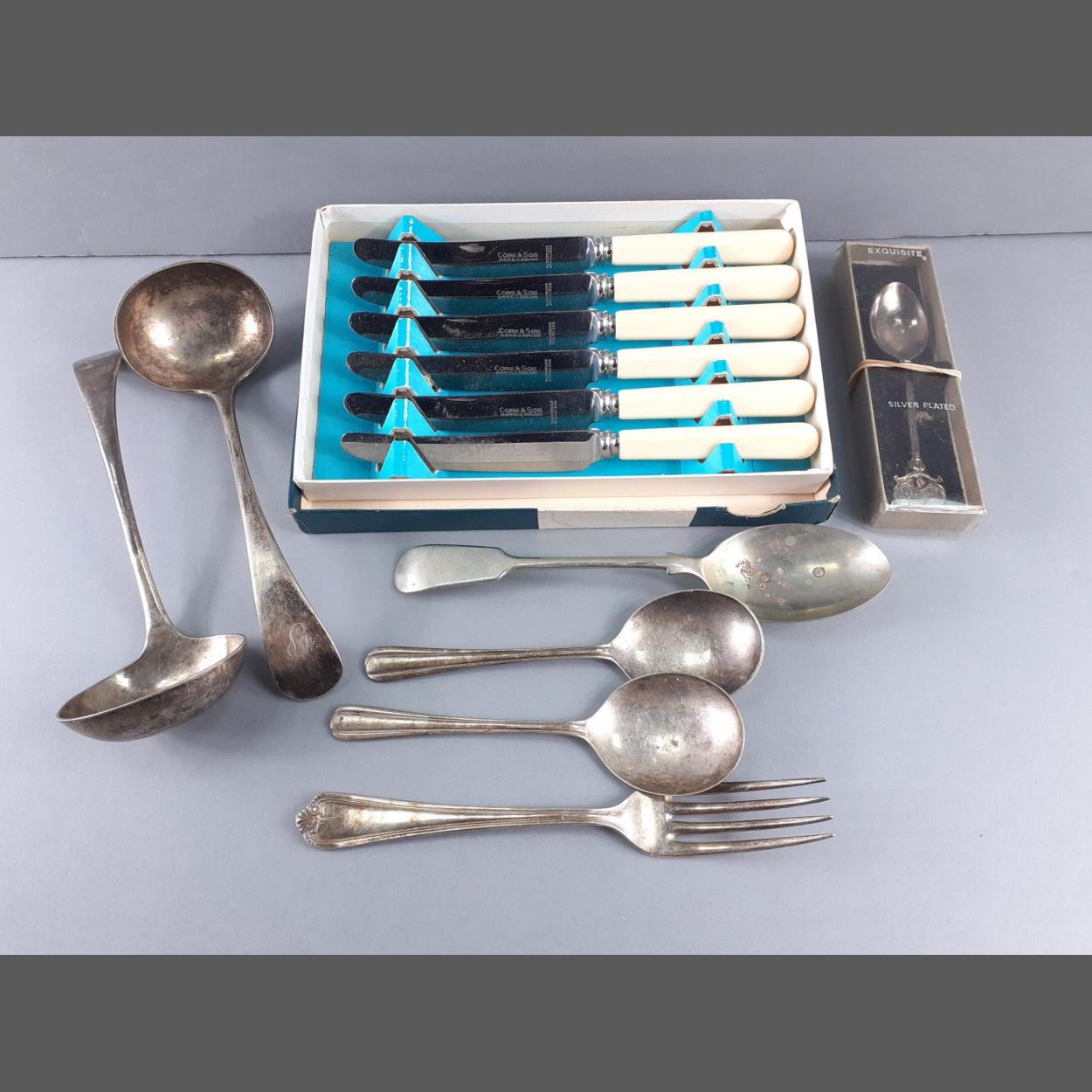 SILVER PLATE flatware collection comprising Cork & Sons boxed knife set, two nice 18cm sauce ladles,