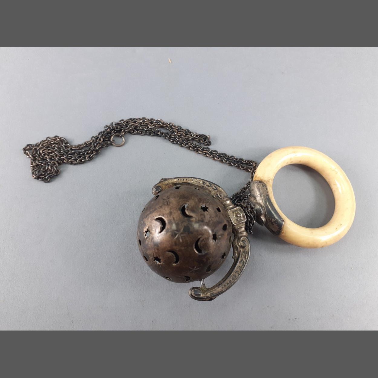 A Victorian child's rattle and teether with chain. Slight dents but a lovely thing..