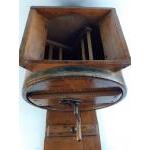 An antique butter churn marked 'New style white cedar cylinder churn number 3, seven gallons' standing 47cm high approx and in working order and in lovely condition