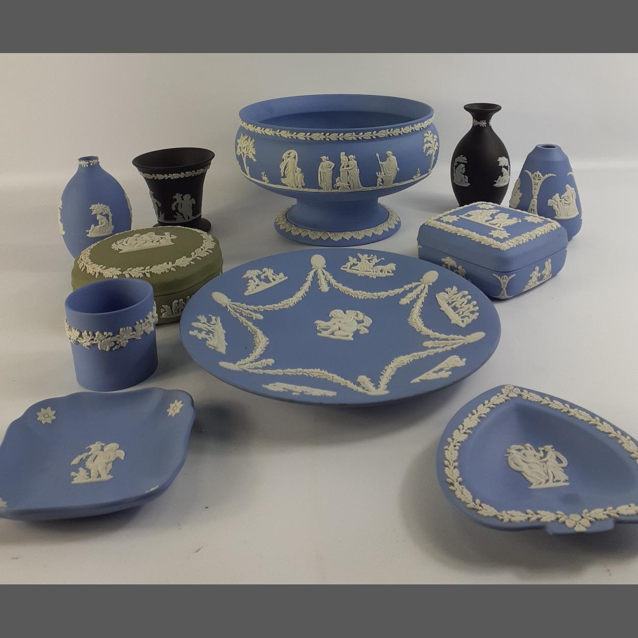 A collection of Wedgwood to include a fruit bowl 22cm dia approx, a 22cm plate, pin dish and 2 trays, 2 small stemmed vases, small pot, a green and 2 black dishes