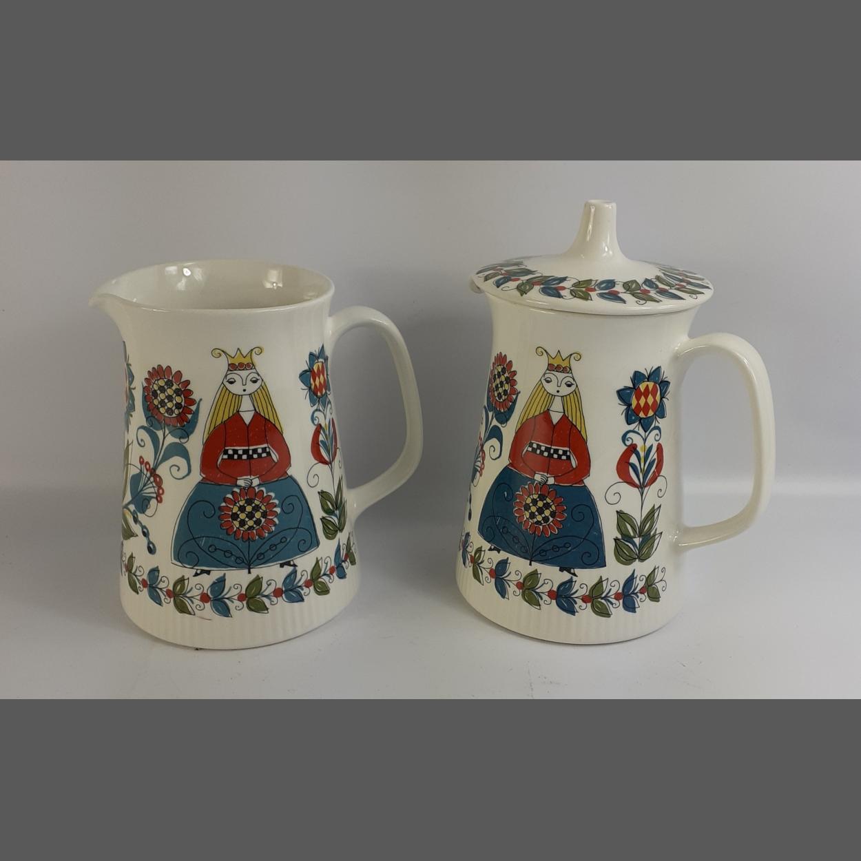 Two Norwegian Norsk design hand-painted pitchers each 17cm tall approx, one with a lid