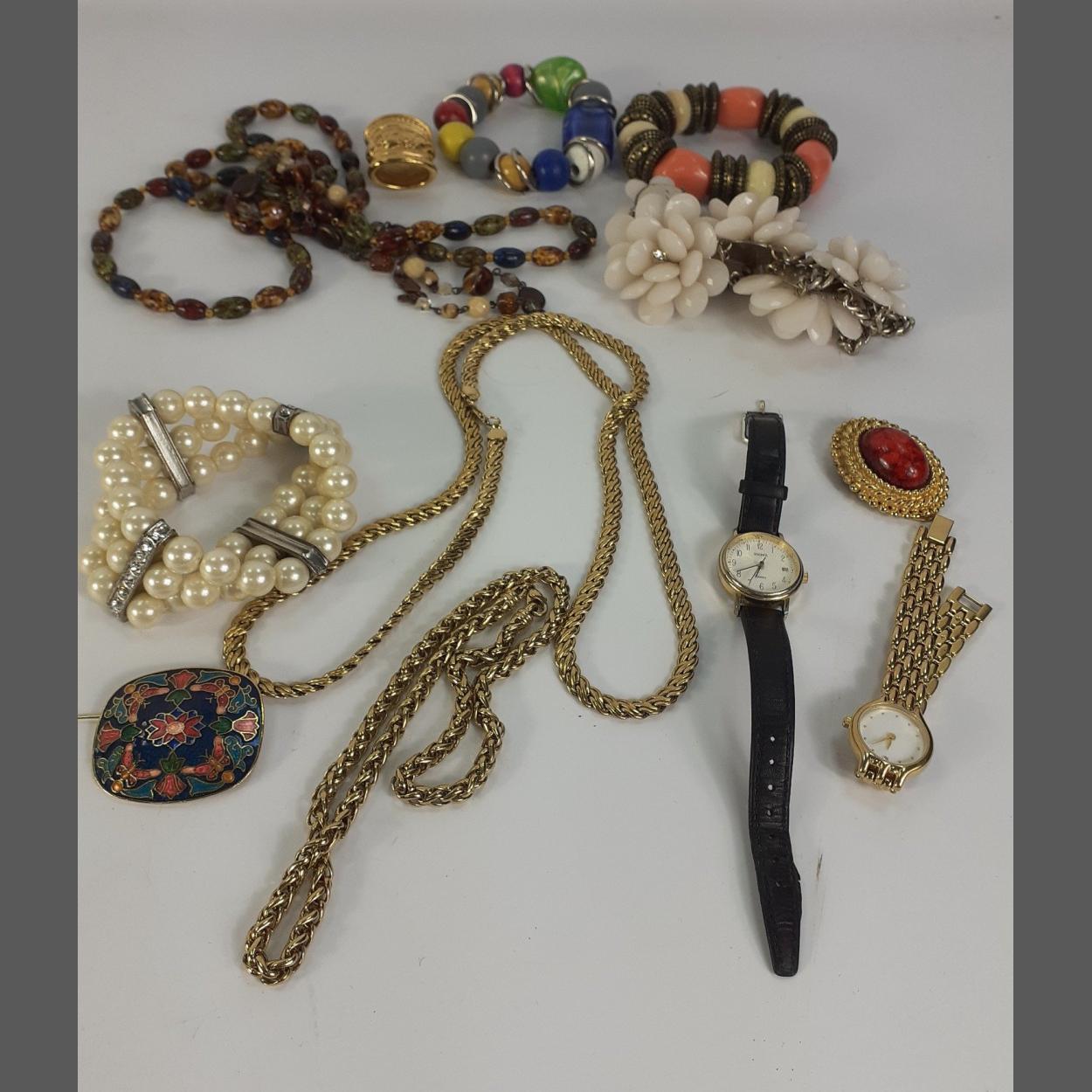 A small collection of costume jewellery mainly chunky bangles, two yellow metal chains 74cm and 46cm, and bracelet and 2 watches one a SEKONDA