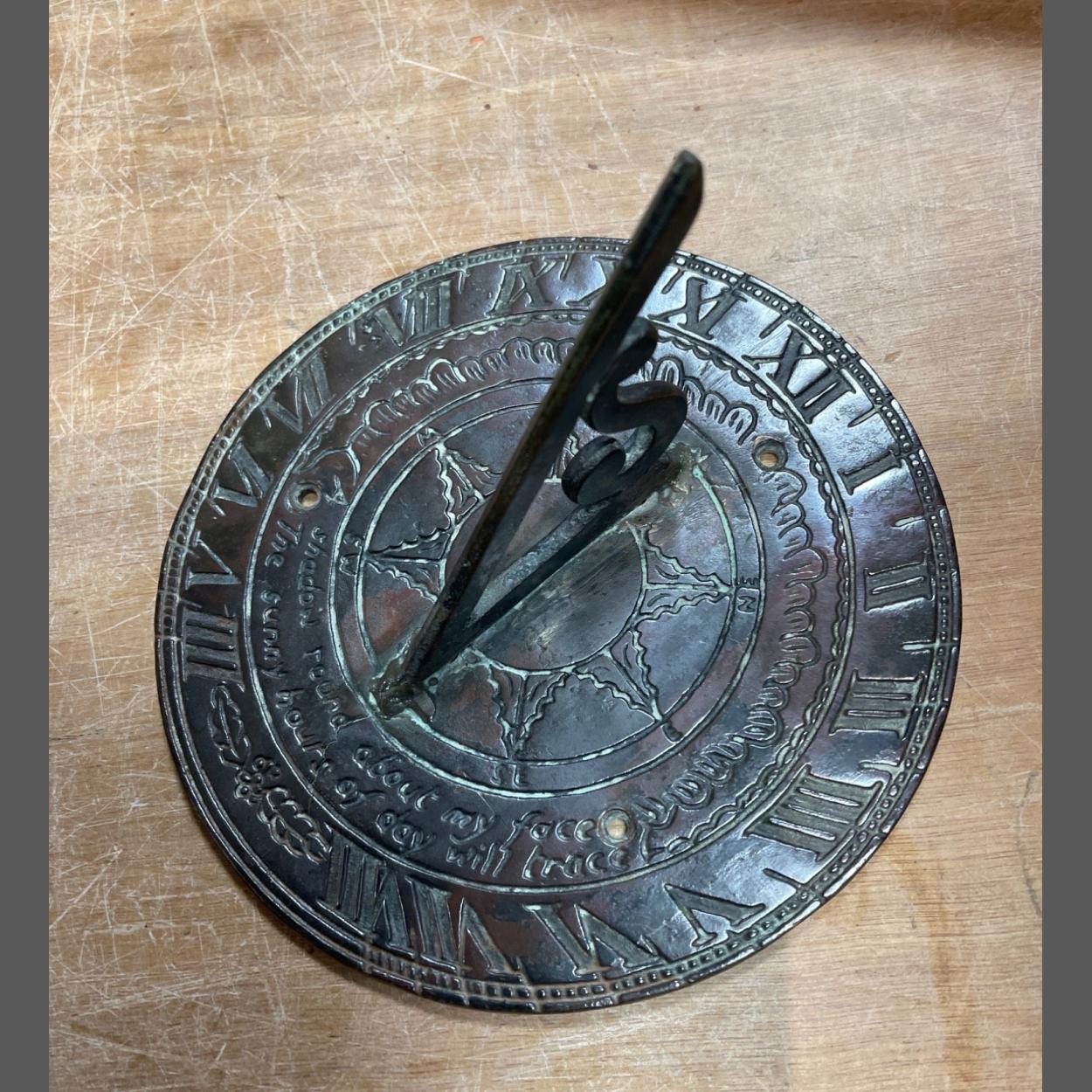 Antique style brass sundial with ''Shadow round about my face, The sunny hours of day will trace. 20cm diameter.