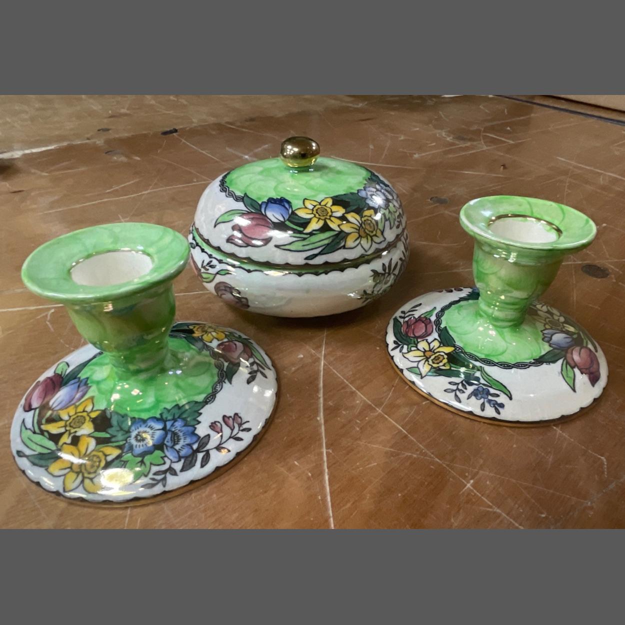 MALINGWARE - a pair of green lustre candlesticks approx 8cm high and a matching lidded trinket dish 9cm diameter approx