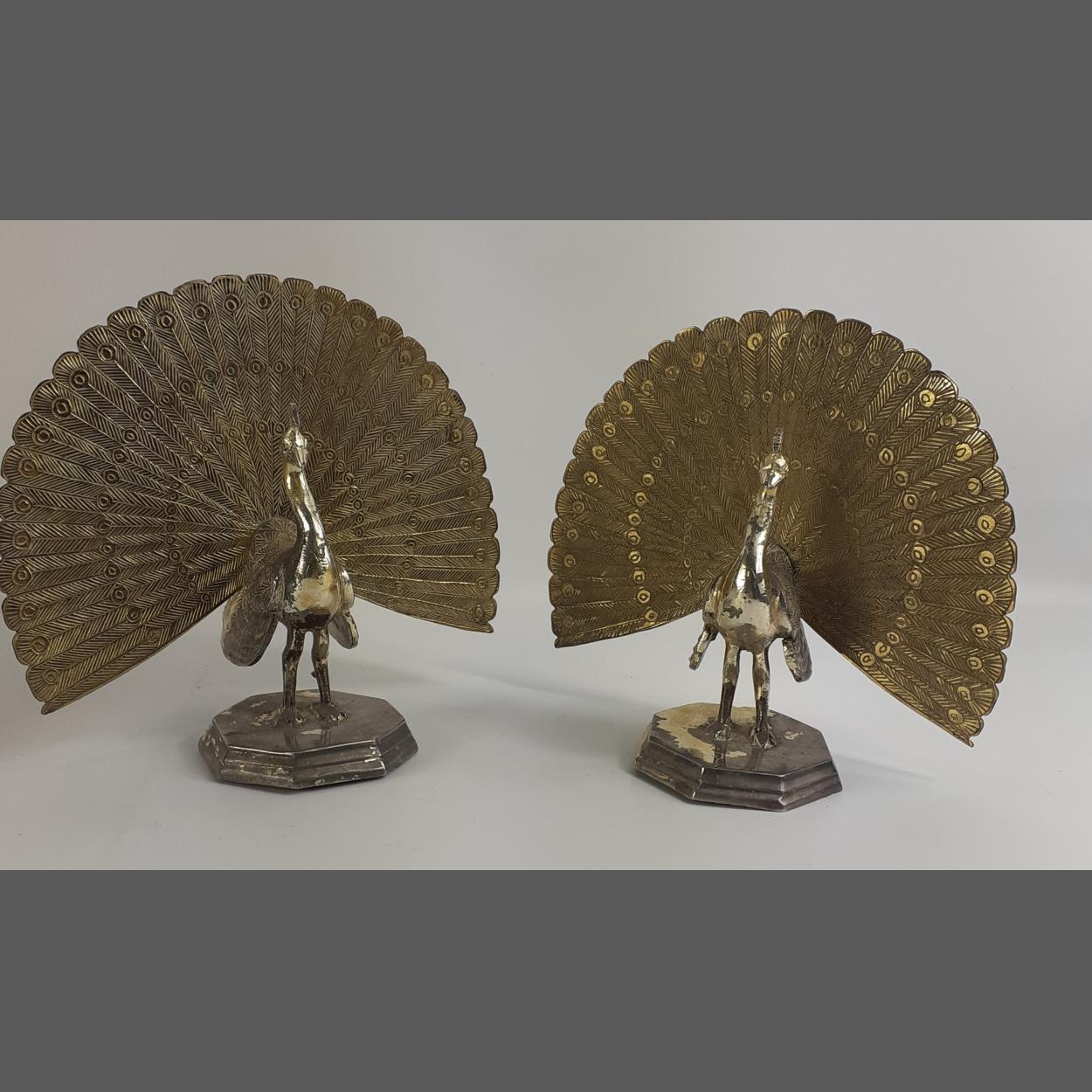 A lovely pair of silvered peacock centrepieces or mantle reflectors. Each stands 16cm tall. Some loss to silvering finish but display very nicely.