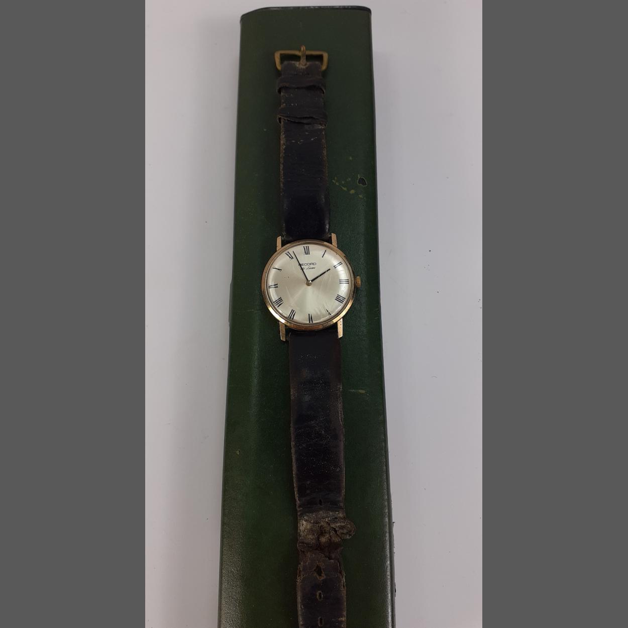 Gents gold plated RECORD de Luxe wrist watch with 25 year service inscription engraved on rear case. Watch running with a gentle wind at time of valuation. Nice classical uncomplicated face. slight marks to crystal, strap is heavily worn and original plastic box has damage but is present.