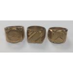 Three chunky gents rings. Yellow metal each stamped 18K 750 but believed brass. Two with COLLECTABLE car logos for Opel and Mercedes.