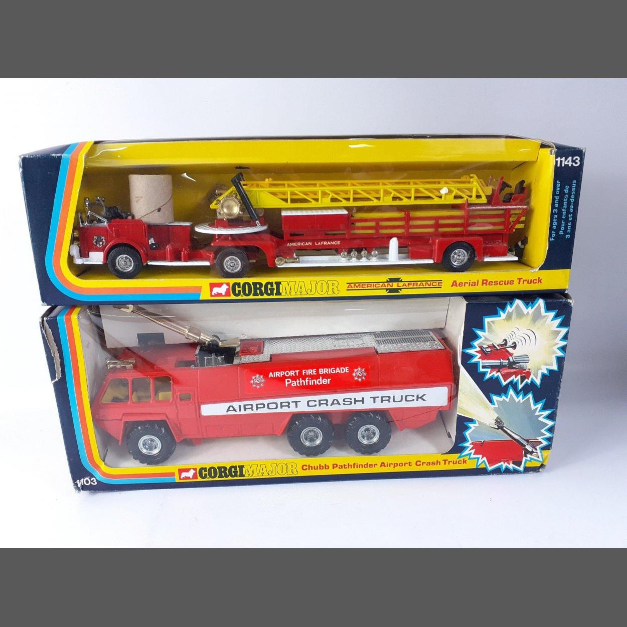 CORGI boxed FIRE ENGINE pair. Comprising 1103 Airport Chubb Pathfinder Airport Crash Truck and 1143 American La France Aerial Rescue Truck. Both in lovely condition with very minor wear to box edges.