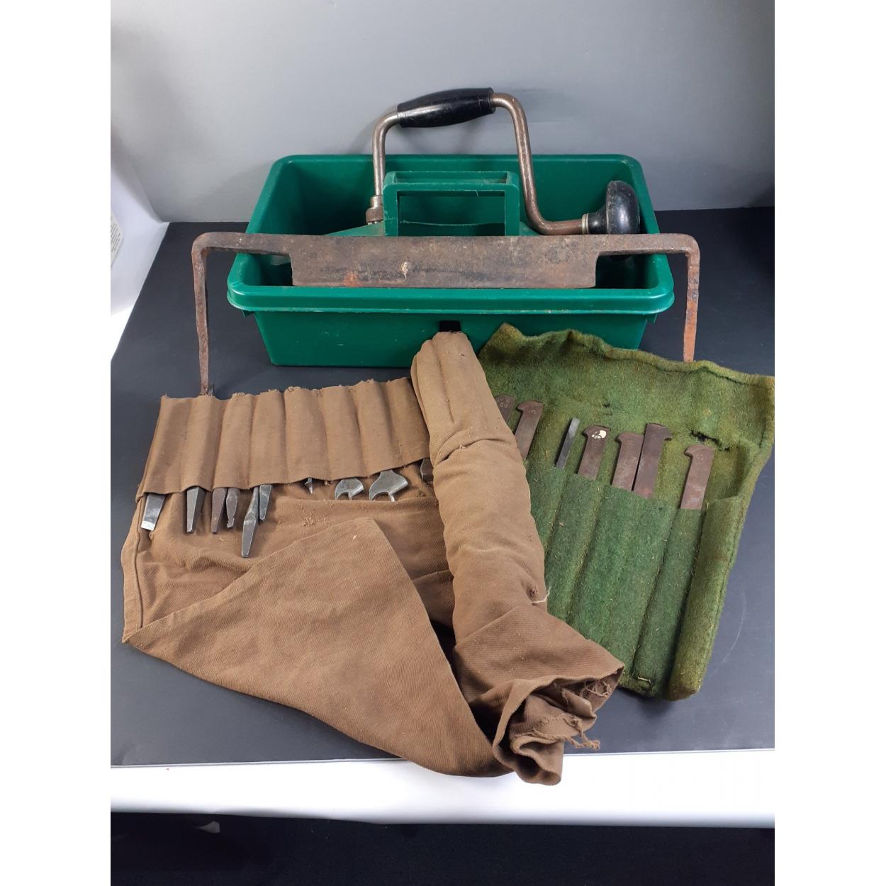 A STANLEY No. 144-10 in Mk3 brace and bit with a quantity of bits and a roll of numbered blades by Howarth for cutting groves in a plough plane. Also a draw blade.