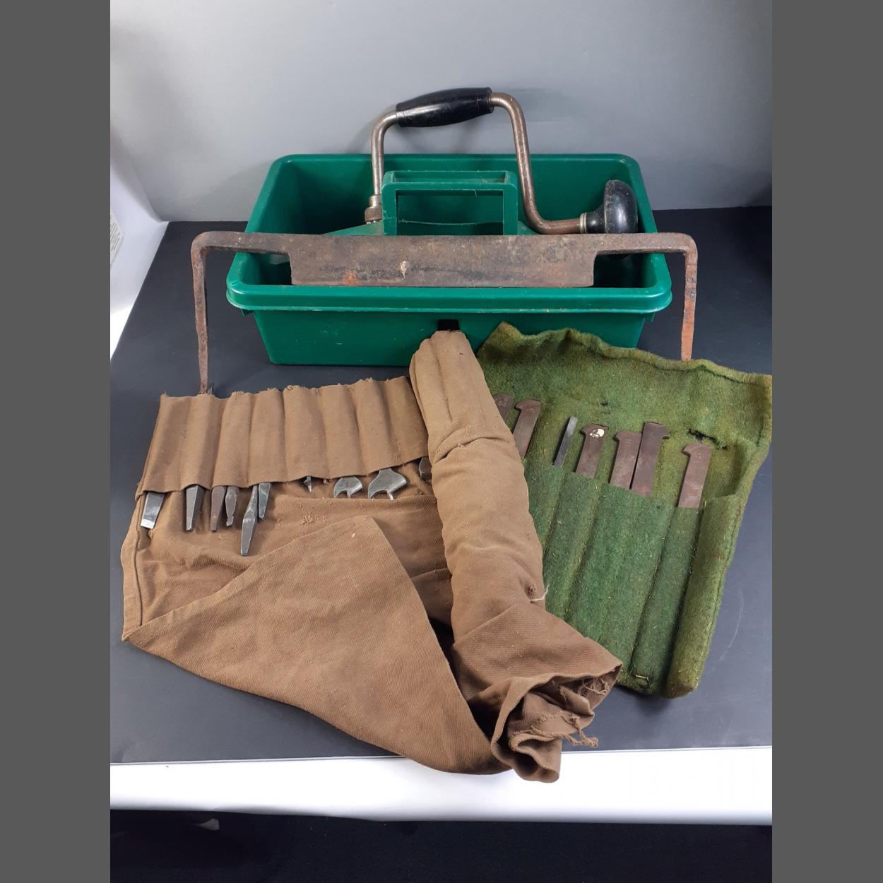 A STANLEY No. 144-10 in Mk3 brace and bit with a quantity of bits and a roll of numbered blades by Howarth for cutting groves in a plough plane. Also a draw blade.