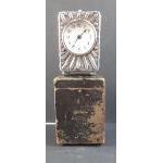 A STUNNING ANTIQUE SILVER carriage clock in travel case. In beautiful condition and ticking away nicely with a gentle wind on valuation and comes with key. Lovely white enamel 5cm dial. Hallmarked LONDON 1893 JB Case Maker. Velvet lined case with slider in place and catch works well. Stands 10cm tall approx. Gross weight 548g approx