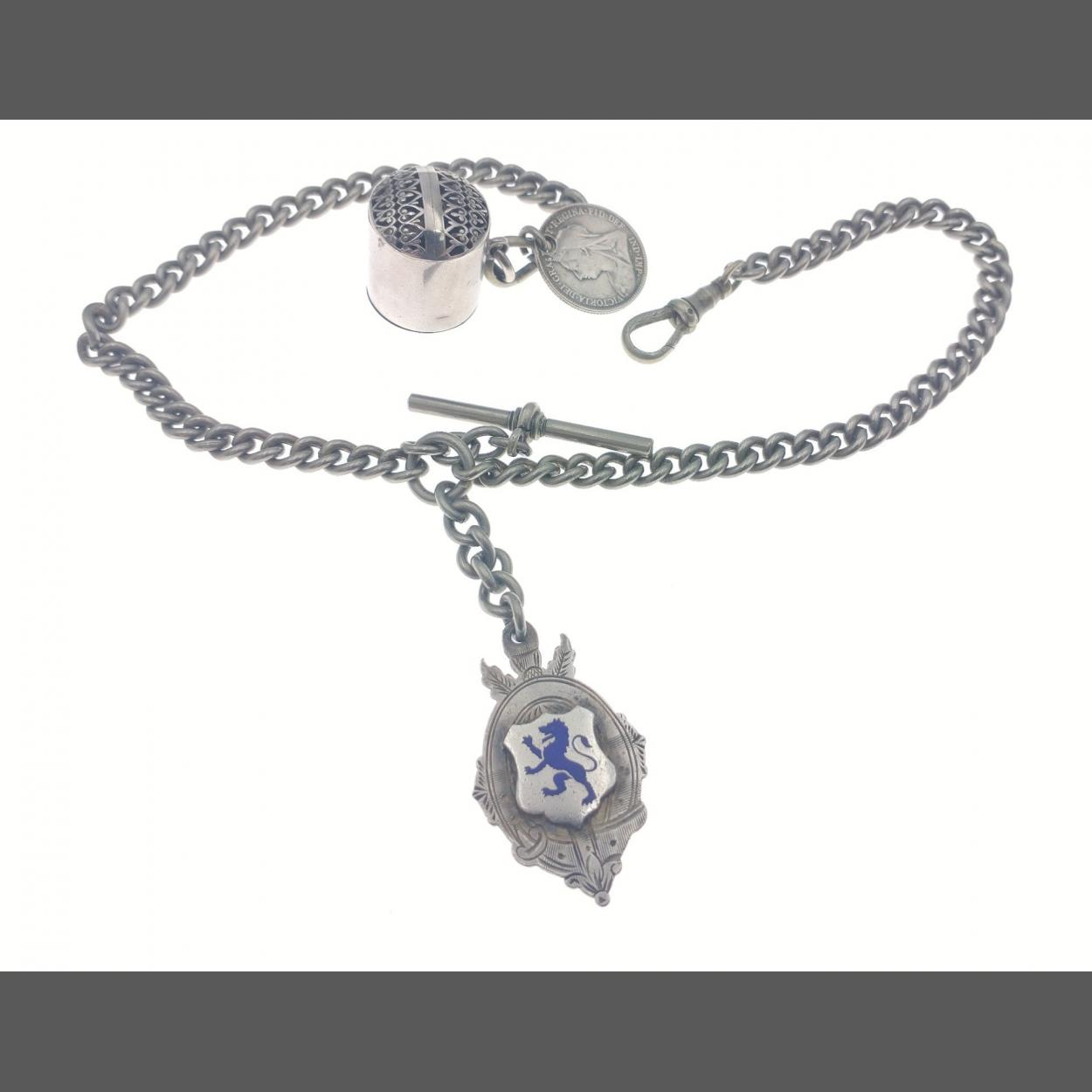 A VINTAGE unmarked white metal NCR Albert watch chain with silver Scottish fob, silver sixpence and a rather lovely unmarked enamelled vinaigrette