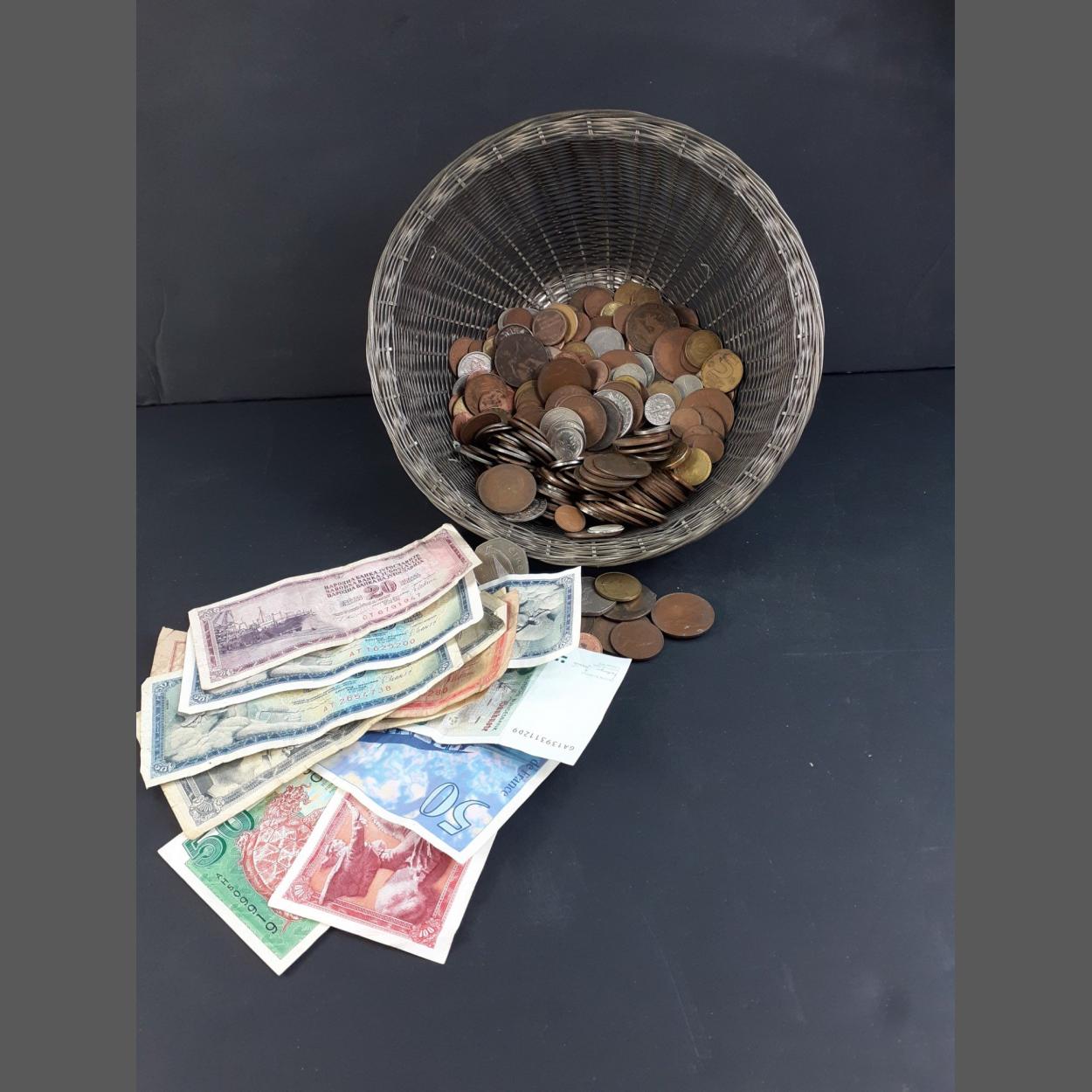 A silvered wicker style basket with a quantity of obsolete UK and World coinage and banknotes. Nice mixed lot.
