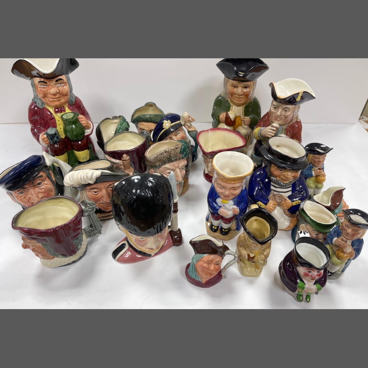 A box of mixed sized TOBY JUGS to include ROYAL DOULTON Three Musketeer figure Aramis, Captain Ahab, Old Salt and a Staffordshire jug Grenadier Guardsman, 23 pieces in total