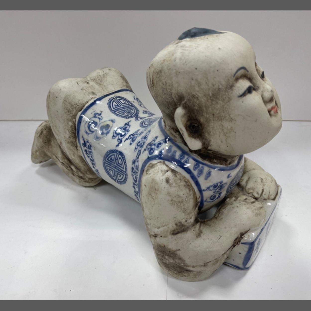 Vintage pottery blue glazed Oriental crawling baby 33cm length and 20cm high, 12cm deep. A cheeky wee thing.