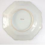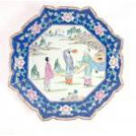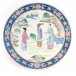 A large vintage Oriental charger with lovely colourful art work. Appears to be a scene of artists folding a scroll. 37cm across and free from chips and cracks. Rings true. A lovely colourful piece. Also a matched smaller piece 27cm across again in good condition.