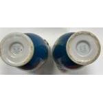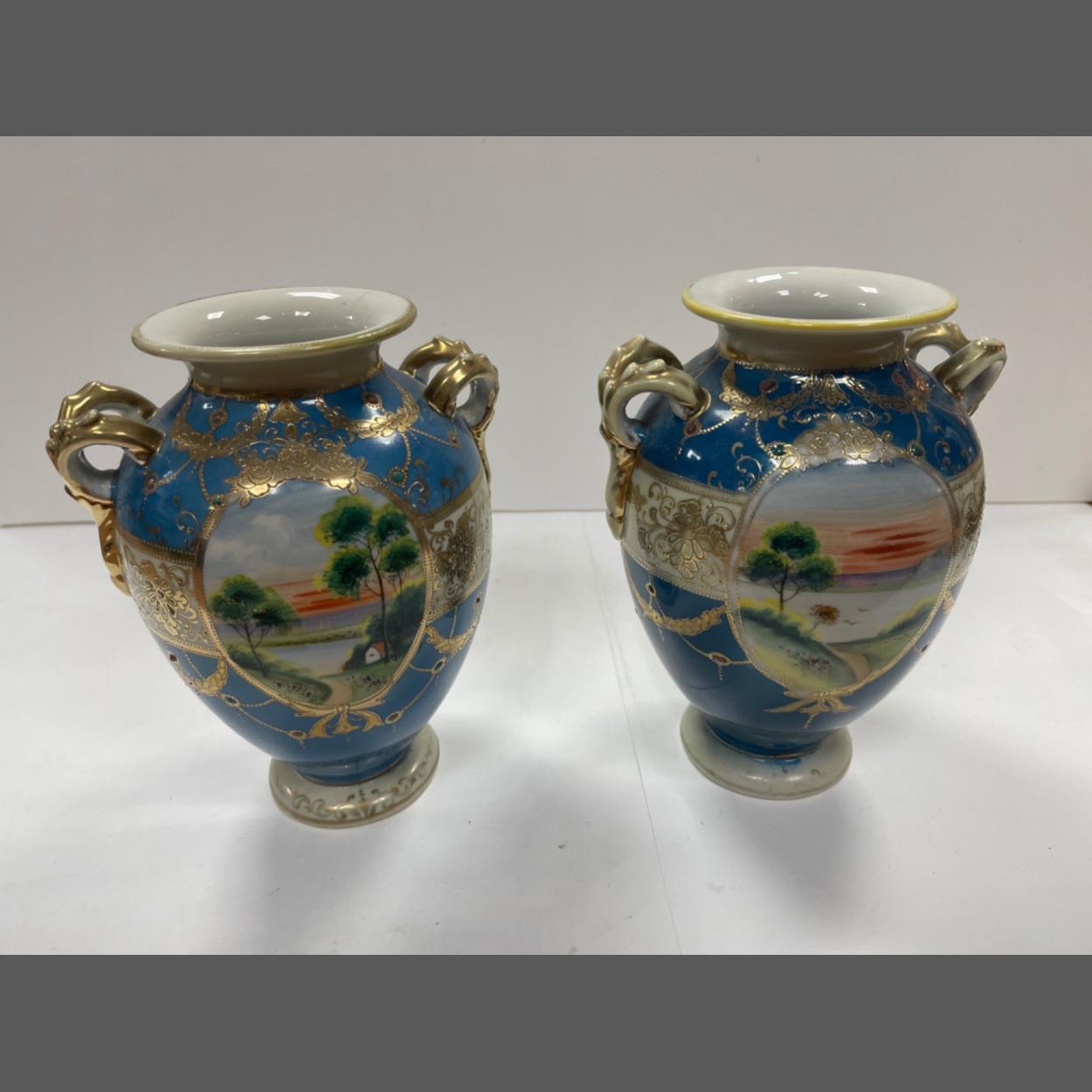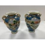 A pair of Japanese urn vases with pastoral scene and gilt decoration each standing 22cm high with a small crack in one rim