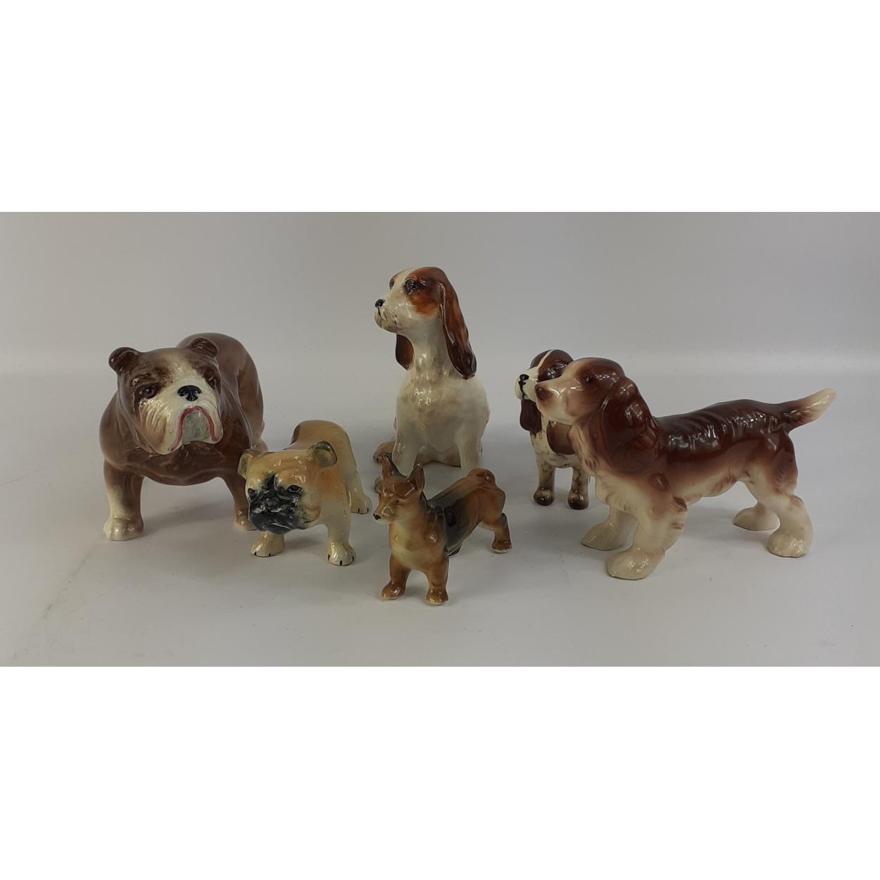 A pack of ceramic dogs which includes a Unicorn hand-painted Spaniel (model 212) and a BESWICK brown and white Spaniel as well as four others. The Pug has a break to the leg otherwise good condition.
