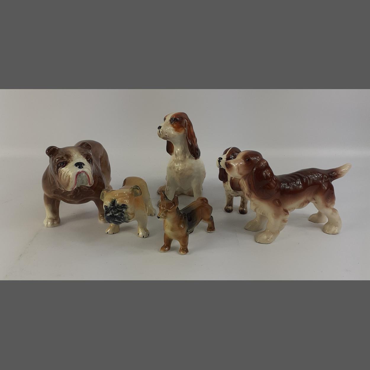 A pack of ceramic dogs which includes a Unicorn hand-painted Spaniel (model 212) and a BESWICK brown and white Spaniel as well as four others. The Pug has a break to the leg otherwise good condition.