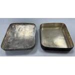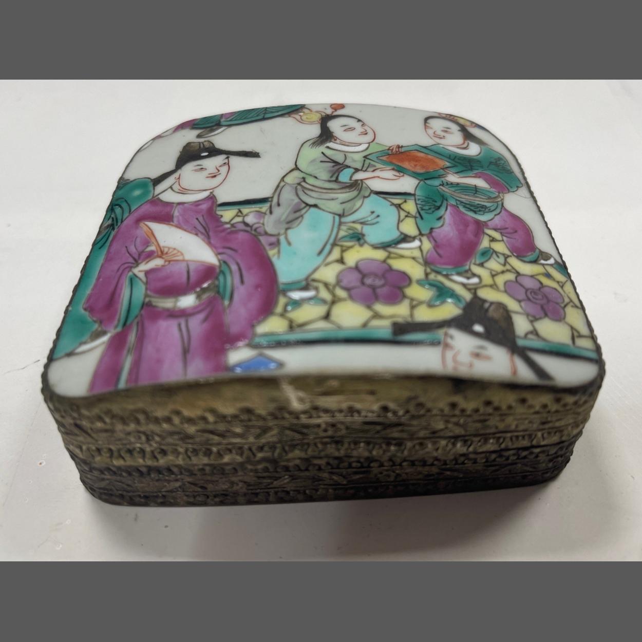 A small Oriental trinket box with an enamelled lid with colourful figures set in a white metal box with heavily decorated edges, 9 x 8 x 3.5cm