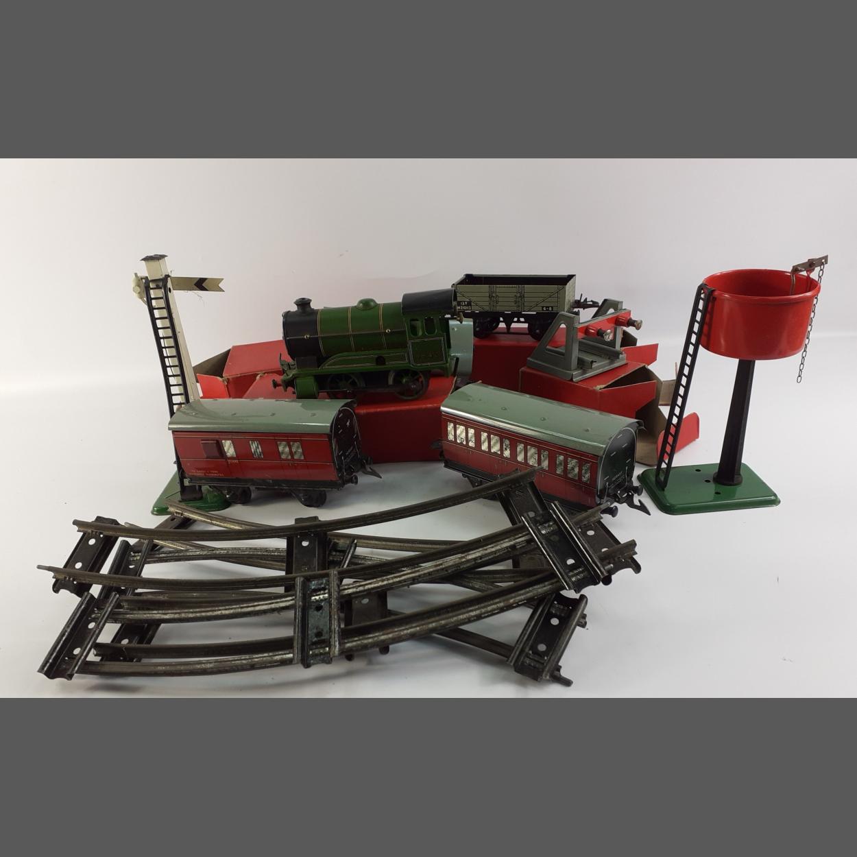 ANTIQUE HORNBY clockwork train set 'O' gauge mostly boxed to include 501 Reversing Locomotive, 41 Passenger Brake Van, coaches and wagon. Also includes Buffer Stop and Reservoir. A great collection nicely presented, includes some track.