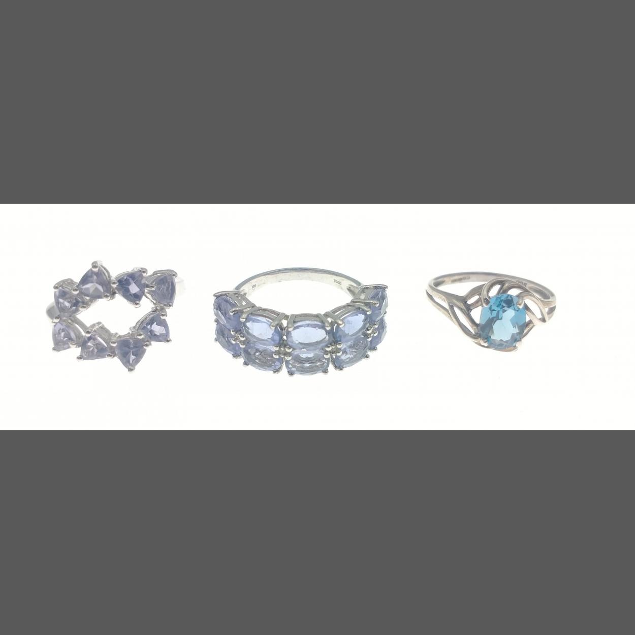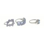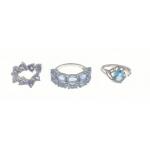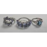 Three boxed STERLING SILVER dress rings in lovely condition. One with 10 lovely large blue stones size O gross weight 3.7g approx. One with band of lilac coloured stones size L gross weight 3.4g approx and the third with a twisted shank and a large blue stone size O gross weight 1.8g approx. A nice presentable clean collection in good order.